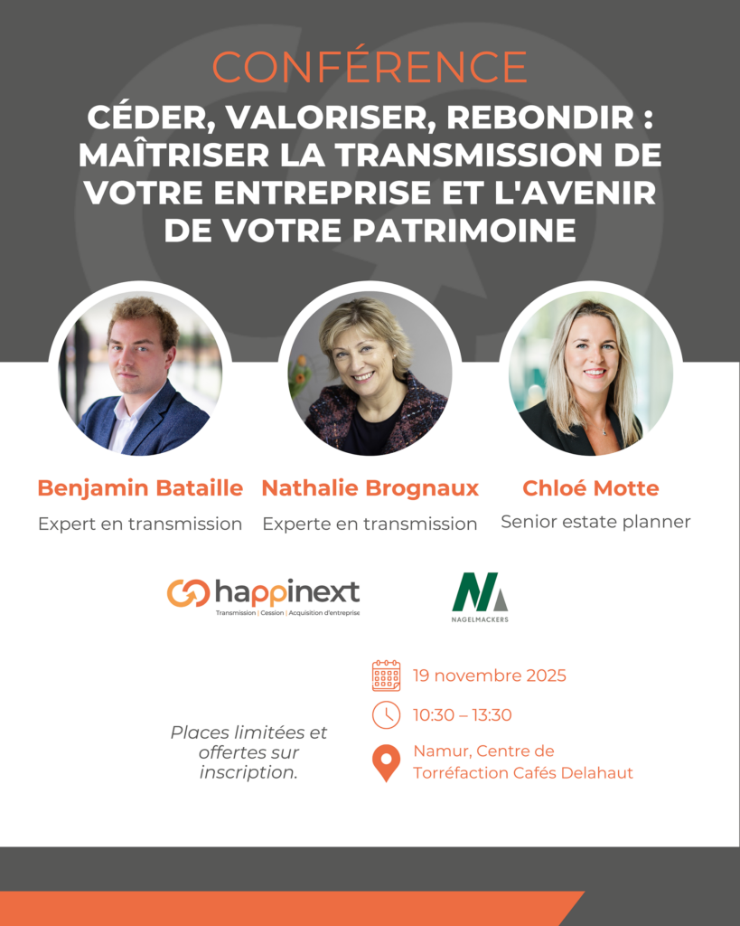Cette conférence croisée réunit Happinext, avec Nathalie Brognaux et Benjamin Bataille, experts de la transmission d’entreprise, et la Banque Nagelmackers, avec Chloé Motte, spécialiste en gestion de patrimoine.